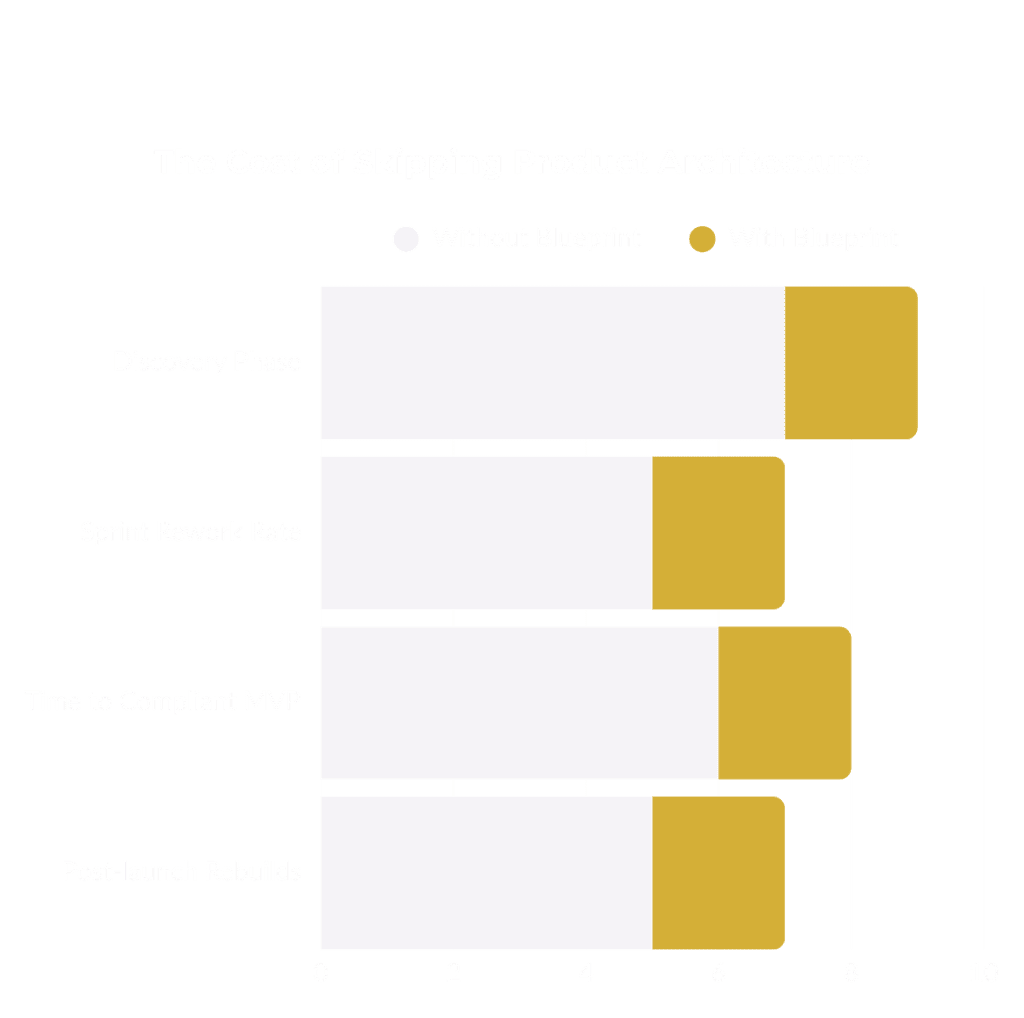 Founders and executives often rush into writing code without a validated, compliance-ready product architecture. The result? Chaotic sprints, burned investor capital, bloated backlogs, and regulatory surprises that force expensive rebuilds.
